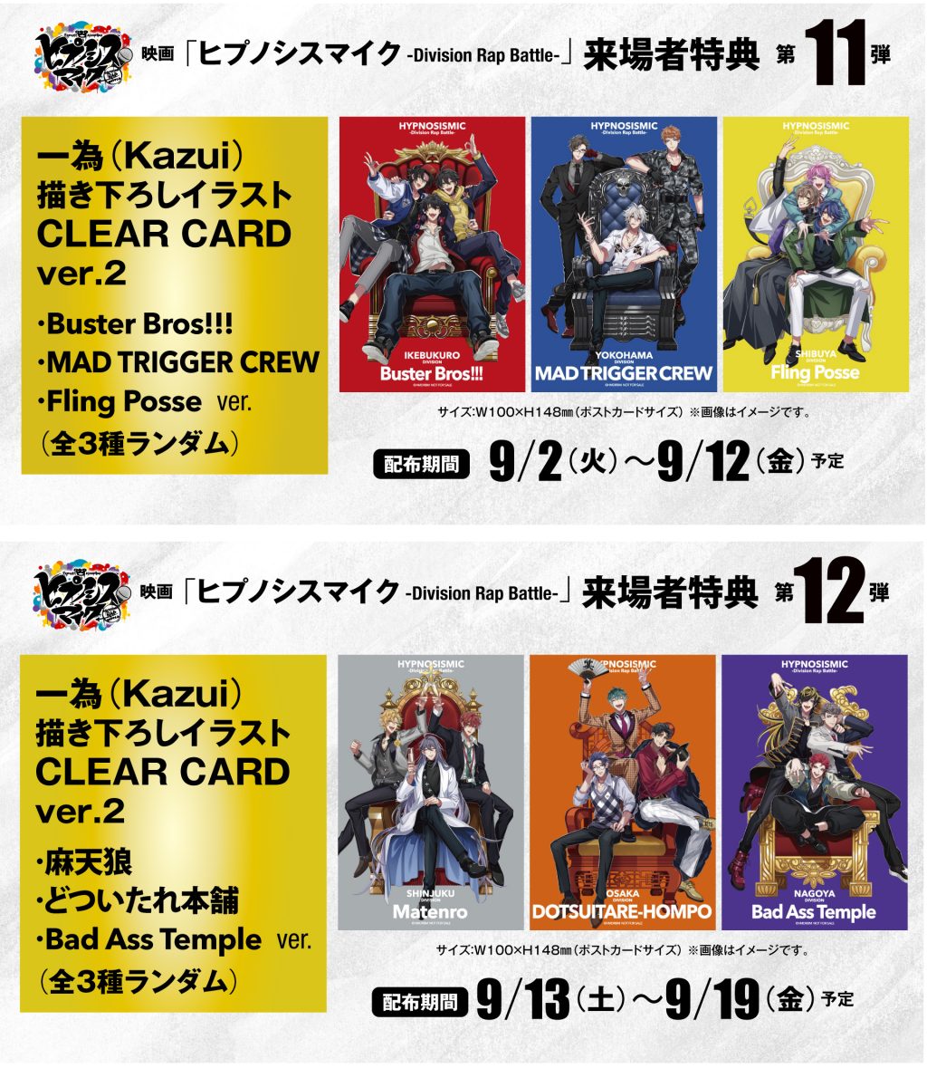 ヒプノシスマイクプロジェクト8周年記念日である昨日、9月2日(火)より全国66館で、本作のリバイバル上映を実施中。来場者特典第11弾(9月12日(金)まで)、第12弾(9月13日(土)~9月19日(金))も配布しています。ぜひ劇場で当社のハイエンドな映像と、インタラクティブを体験してください。